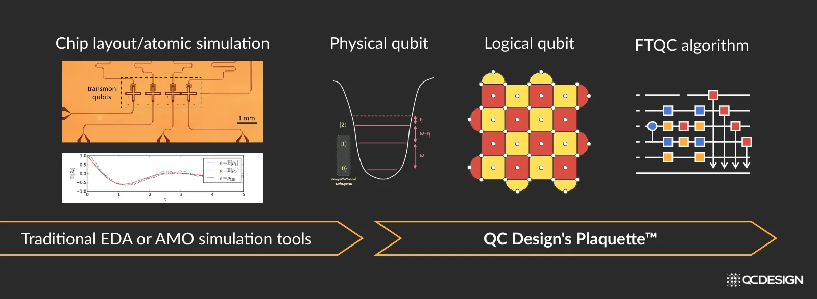 For companies working on superconducting qubits, photonics, or spin qubits, the early stage of the design workflow might include traditional EDA tools for designing chips (some examples are tools from Cadence, Synopsis and Ansys). For companies working on neutral atoms and trapped ions, it might be more in the direction of atomic simulations, usually performed in-house. These tools provide hardware manufacturers with designs for physical qubits and information about the errors that act on these physical qubits when quantum gates are applied on them.