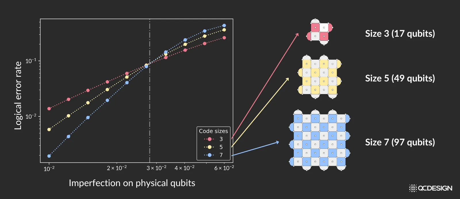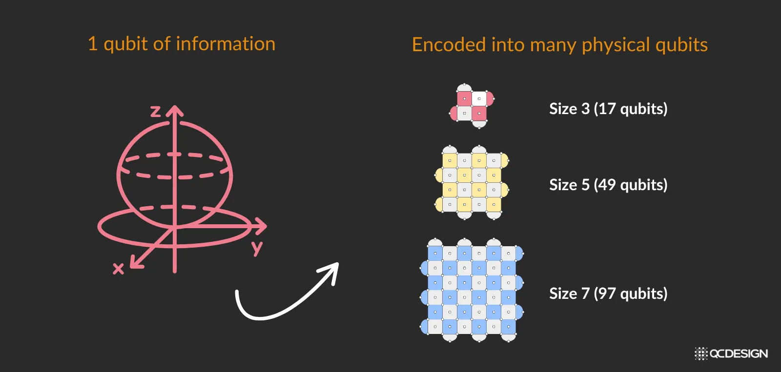 A logical qubit takes one qubit of information and encodes it into many physical qubits. Consider the example of a surface code. The “size” of the encoding of a surface code qubit can be quantified by a number called the “distance”. In the example below, we can see surface codes of distance, 3, 5, 7. One qubit of information is encoded into logical qubits comprising 17, 49 or 97 physical qubits, respectively.
