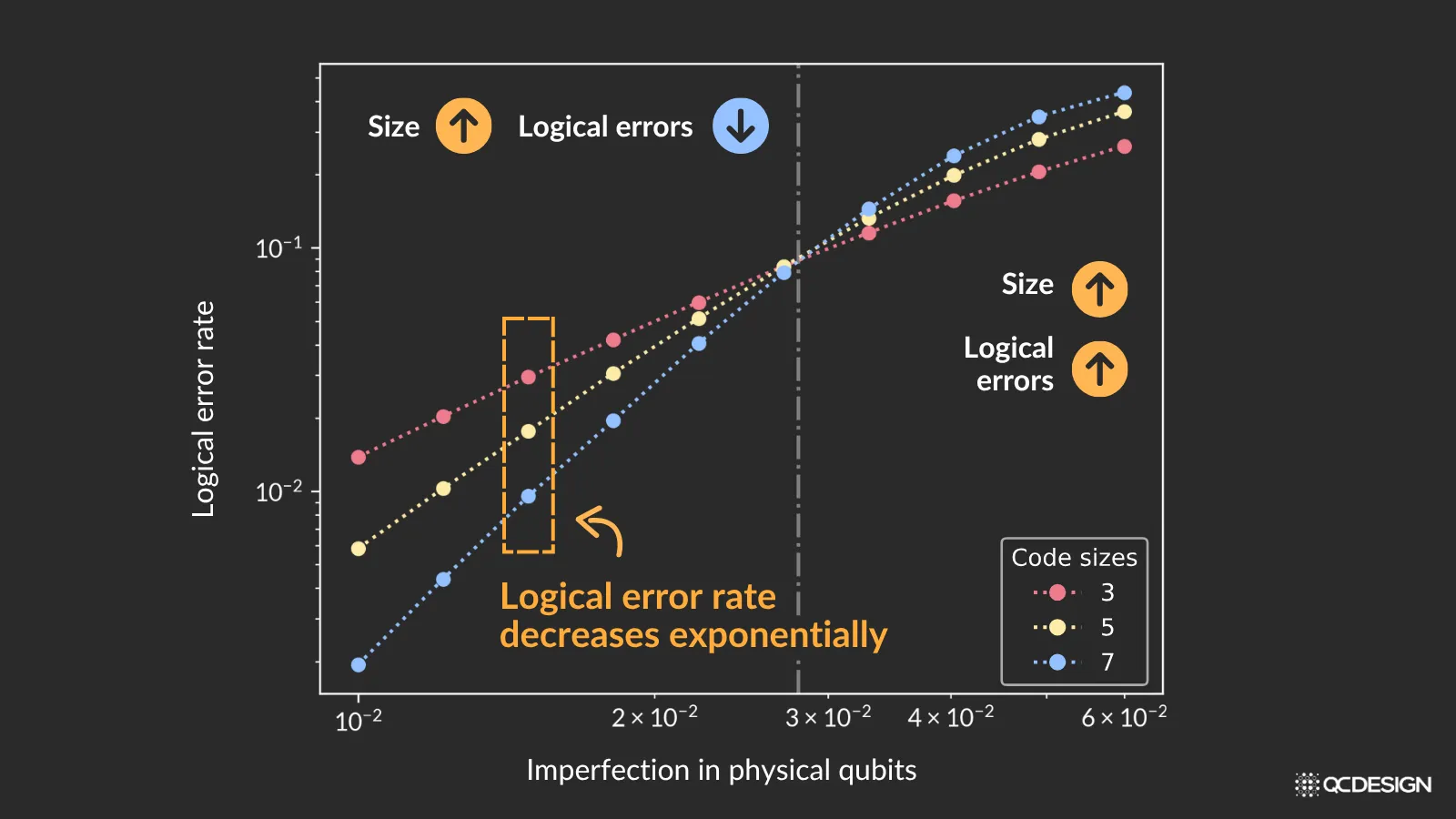 Let’s start by looking at the plot to the right of this vertical line. This is where the qubits are quite noisy. Notice that the blue curve (code size = 7) is above the yellow curve (code size = 5), which is above the red curve (code size = 3). This tells us that if you make the logical qubit larger (increase the code size), by adding more physical qubits, the error in the logical qubit actually goes up. That’s not what we want to see in our system.