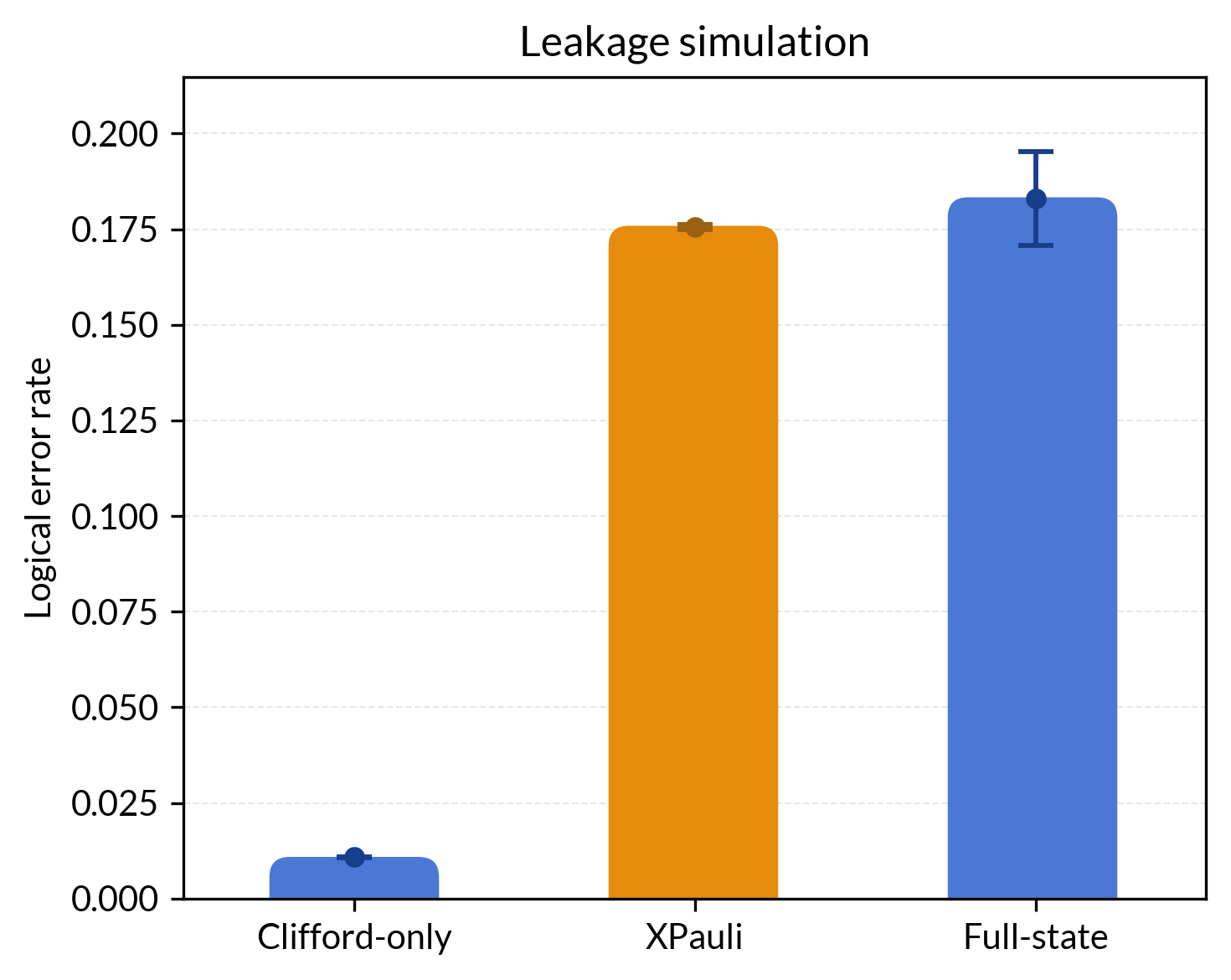 Conventional quantum simulation tools typically trade off simulation speed with simulation accuracy: on the one end, full-state simulators accurately capture the full quantum state of the system, but are inherently slow and limited to modest qubit counts, typically tens of qubits; at the other extreme, stabilizer simulations are restricted to Clifford circuits, they offer speed but support only simple imperfections, namely Pauli errors and erasures. This dichotomy prevents accurate investigation of quantum error correcting code performance and rapid iteration of different quantum architectures, especially when errors involving higher energy levels (e.g., leakage) or when non-Clifford errors (e.g., coherent over-rotations), are present.